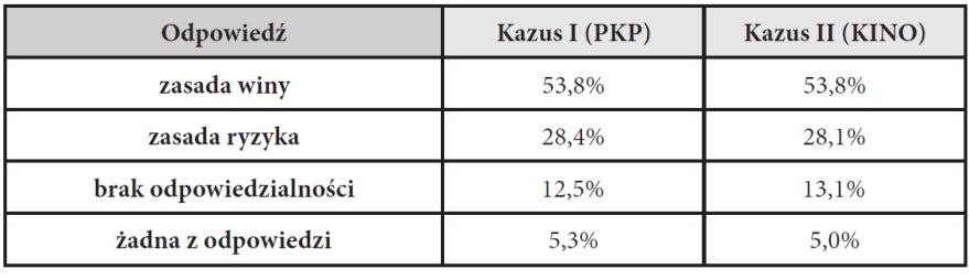 Kazus I brzmiał następująco: Pasażer poślizgnął się zimą na oblodzonym peronie PKP i złamał nogę. W momencie tego zdarzenia pociągu nie było jeszcze na stacji. PKP dołożyły należytej staranności, aby zabezpieczyć peron, w szczególności pracownicy kolei posypali peron solą oraz specjalnym produktem przeznaczonym do zabezpieczania przed oblodzeniem, niestety okazało się to niewystarczające. Kto powinien zapłacić pasażerowi odszkodowanie? Jak widać, przytoczony stan faktyczny odpowiadał wskazywanemu często w doktrynie przykładowi zastosowania art. 435 § 1 k.c. pomimo braku bezpośredniego związku szkody z wykorzystaniem przez przedsiębiorstwo sił przyrodyPor. m.in. W. Czachórski, Czyny niedozwolone..., s. 612; Z. Radwański, A. Olejniczak, Zobowiązania..., s. 251; M. Zelek, Ruch przedsiębiorstwa lub zakładu..., s. 911; R. Longchamps de Bérier, Zobowiązania..., s. 277; S. Garlicki, Odpowiedzialność cywilna..., s. 42; A. Śmieja, Czyny niedozwolone..., s. 589.. Uczestnicy mieli do wyboru cztery warianty odpowiedzi: (i) PKP – mimo podjętych prób starannego zabezpieczenia peronu przed oblodzeniem, (ii) PKP – ale tylko wtedy, gdyby pracownicy nie posypali peronu solą i stosownym produktem zabezpieczającym, (iii) Nikt – pasażer powinien bardziej uważać bez względu na to, czy pracownicy posypali peron solą, czy nie, (iv) Żadna z powyższych odpowiedzi nie jest zgodna z moją opinią. Pierwsze rozstrzygnięcie z założenia miało być zbieżne z przyjęciem, że PKP odpowiadają za tego rodzaju szkodę na zasadzie ryzyka, z kolei drugi wariant miał konstruować odpowiedzialność na zasadzie winy. Z uwagi jednak na to, że ankieta adresowana była przede wszystkim do osób nieposiadających prawniczego wykształcenia, konieczne było zrezygnowanie z określeń języka prawniczego na rzecz bardziej opisowych wariantów odpowiedzi.